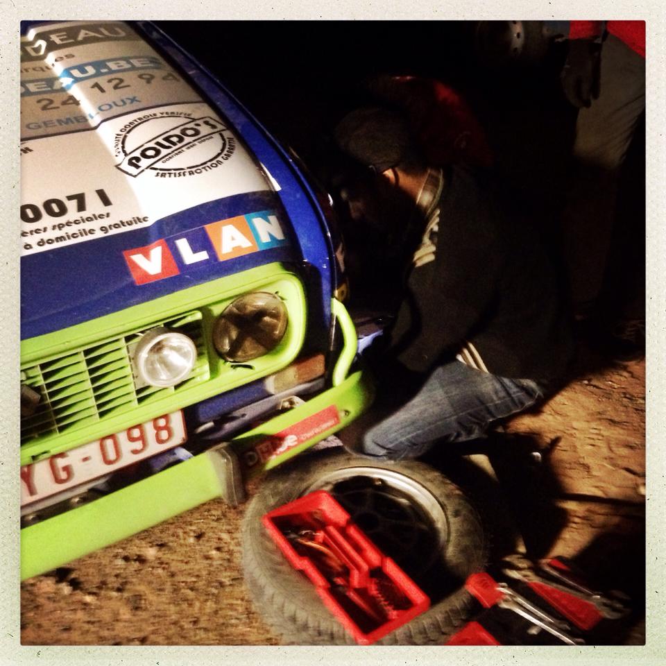 Malheureusement pour nous, ces premiers kilomètres de pistes ont été nocifs à notre voiture. Arrivé au bivouac, nous avons remarqué que le soufflet du cardan gauche était déchiré. Nous avons donc du le changer. Super ! On avait jamais fait ça et le camion principal d’assistance était toujours sur la liaison. Je me suis donc mis à changer le cardan avec l’aide d’un autre trophiste. Pour finir le camion est arrivé et nous avons tout de suite été pris en charge pour la remonte de la nouvelle pièce. L’organisation fait appel également aux locaux pour donner un coup de main. C’est impressionnant de voir la connaissance des marocains en terme de 4L. Celui qui s’est occupé de nous, nous a remis le cardan en moins de temps qu’il faut pour le dire.