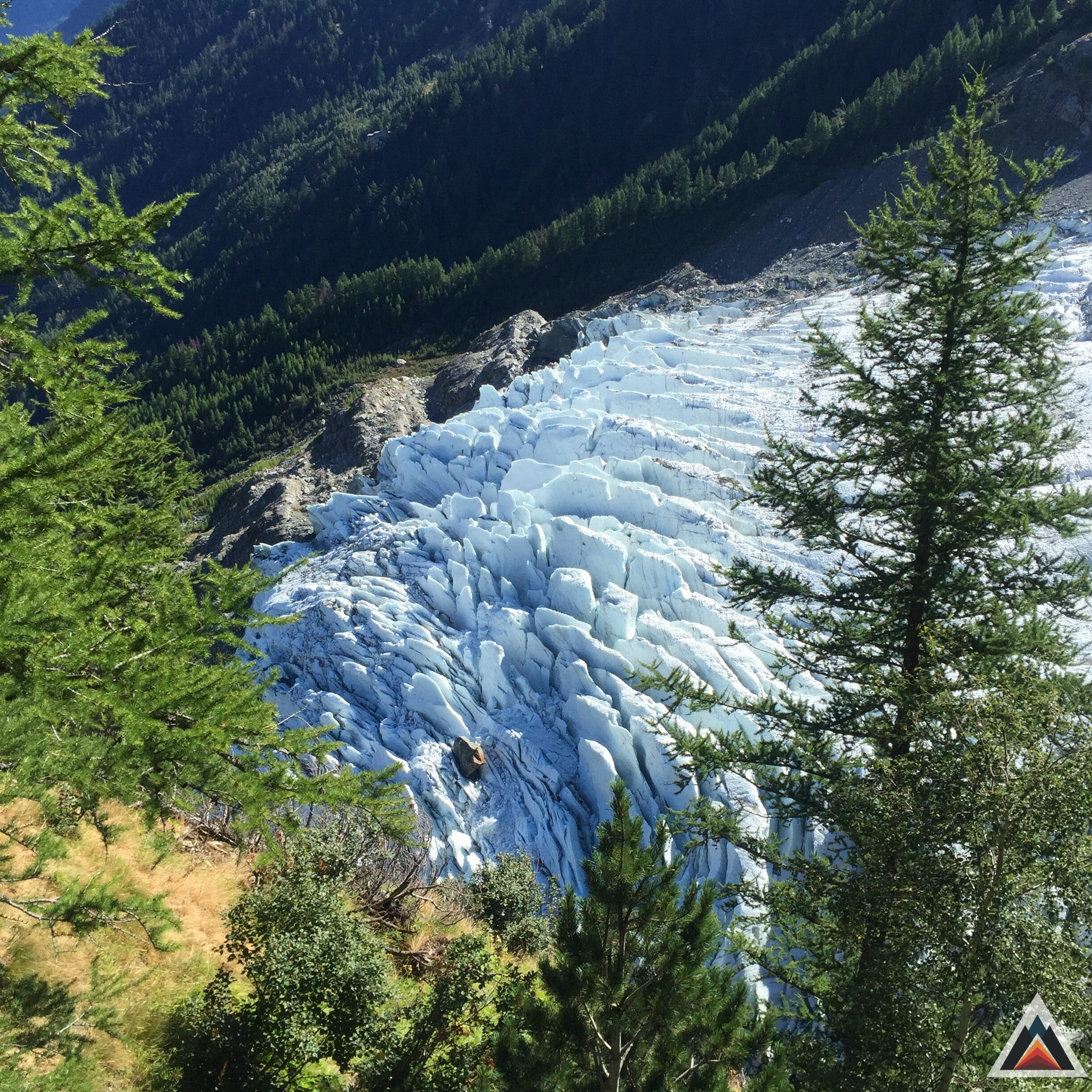 Entre le chalet des Bossons et celui des Pyramides, le parcours reste majoritairement sous la végétation mais certaines trouées vous offriront de magnifiques panoramas tantôt sur le Glacier des Bossons tantôt sur le Glacier de Taconnaz. En effet, le parcours oscille entre les deux versants de l’arête. Cela vous permet de contempler les deux glaciers et leurs univers spécifiques. Au fur et à mesure de votre avancée, le parcours deviendra de plus en plus pentu jusqu’à atteindre la buvette des Pyramides.
