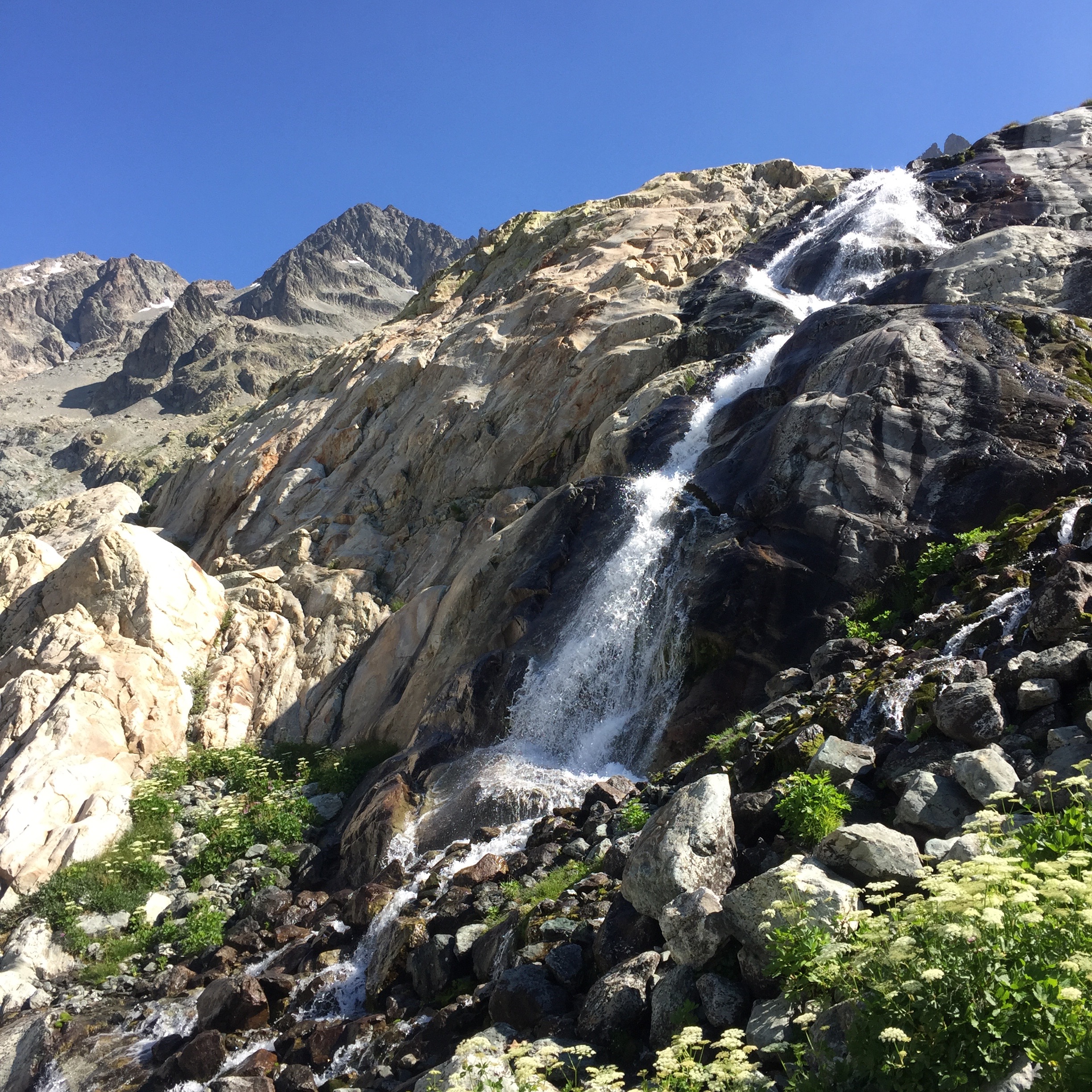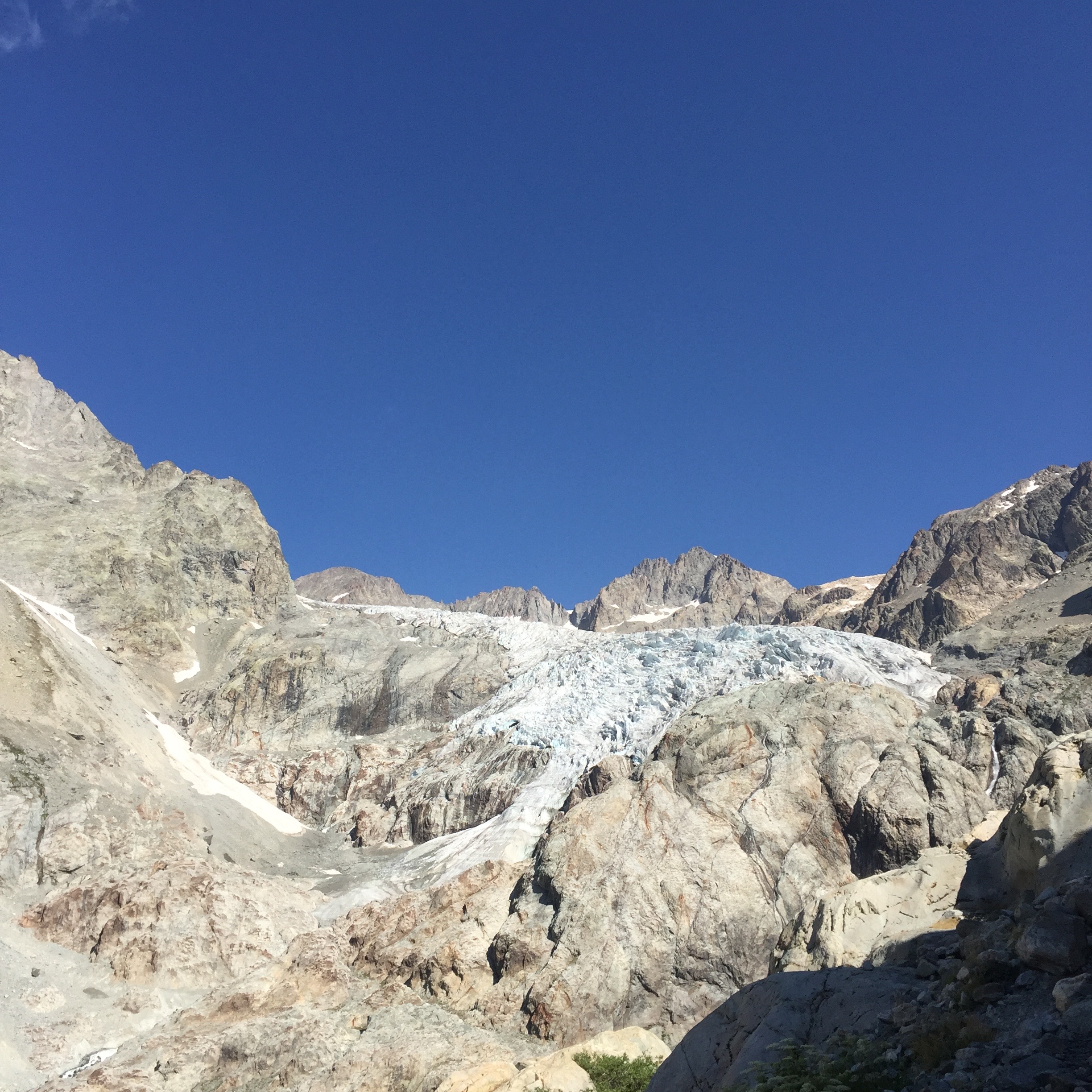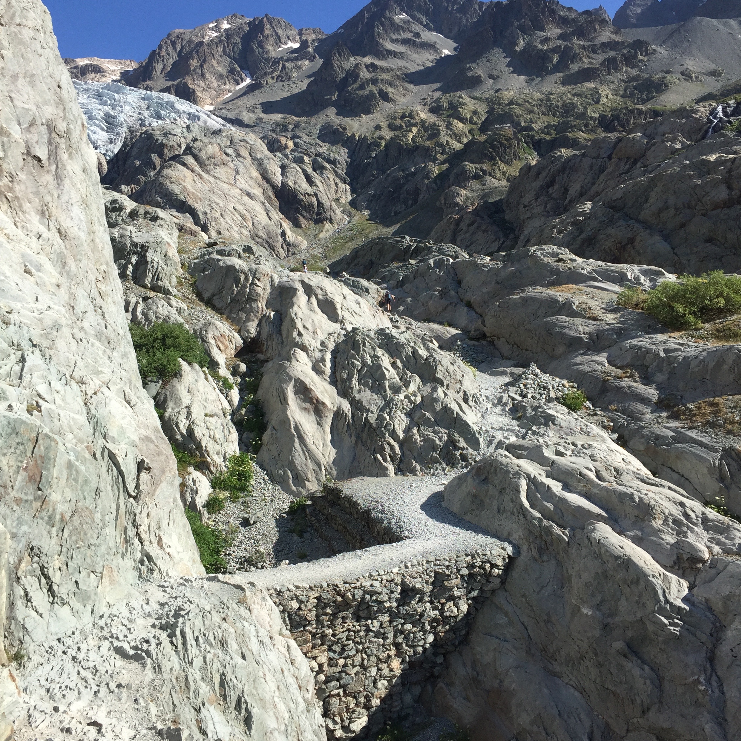 À partir de là, le parcours se fait progressivement de plus en plus alpin. Nous sommes à 2200m d’altitude et le paysage change pour dévoiler progressivement l’objet de notre effort : le Glacier Blanc.