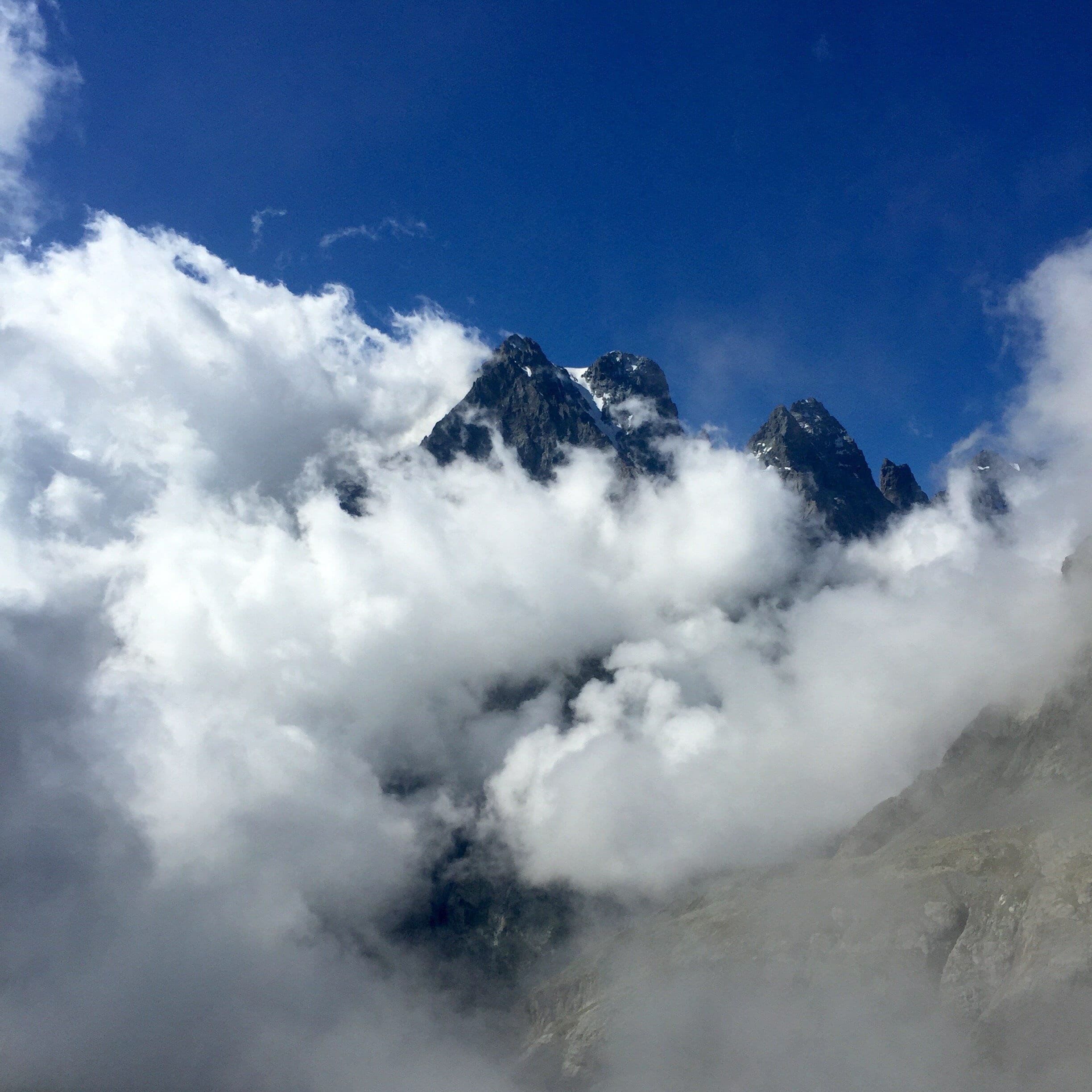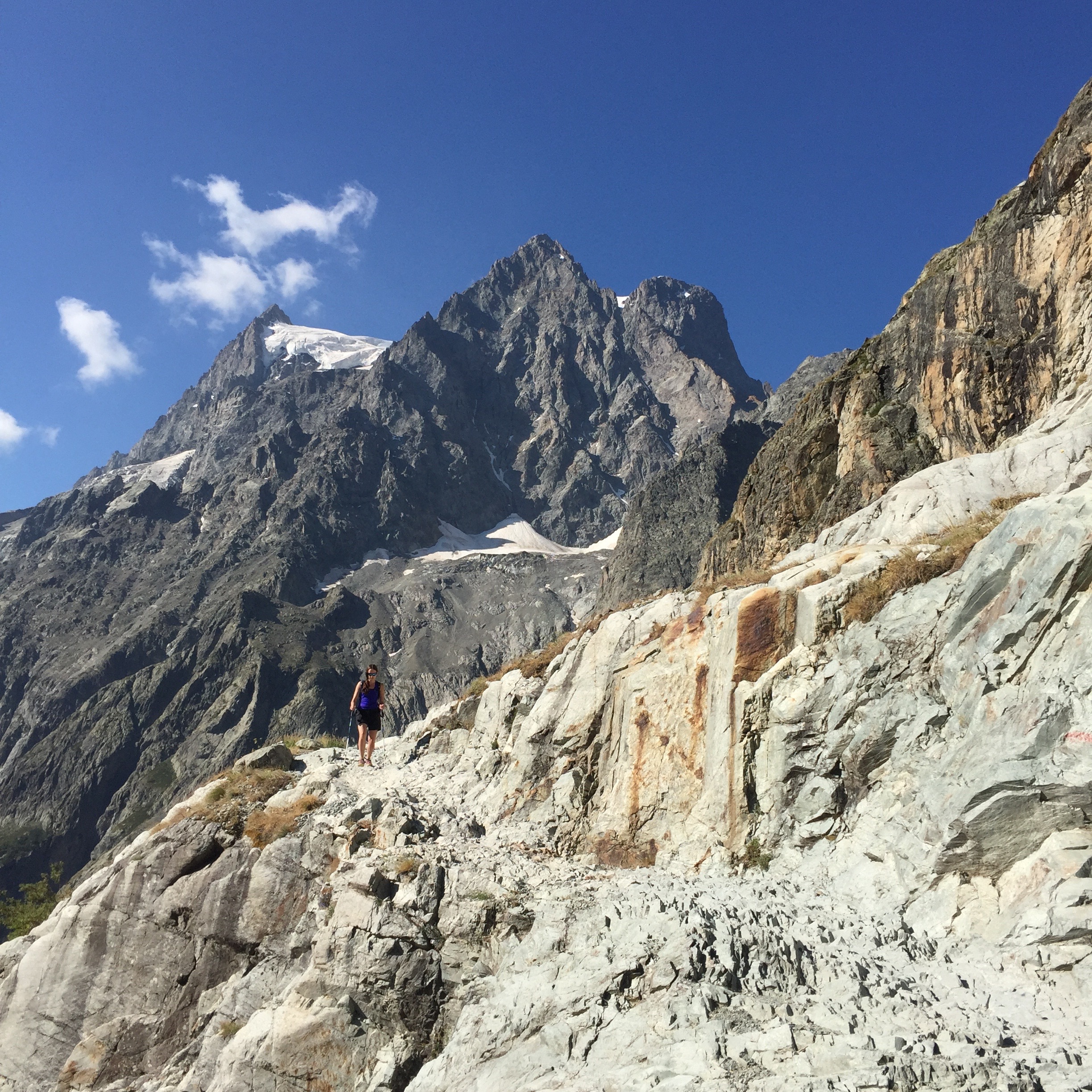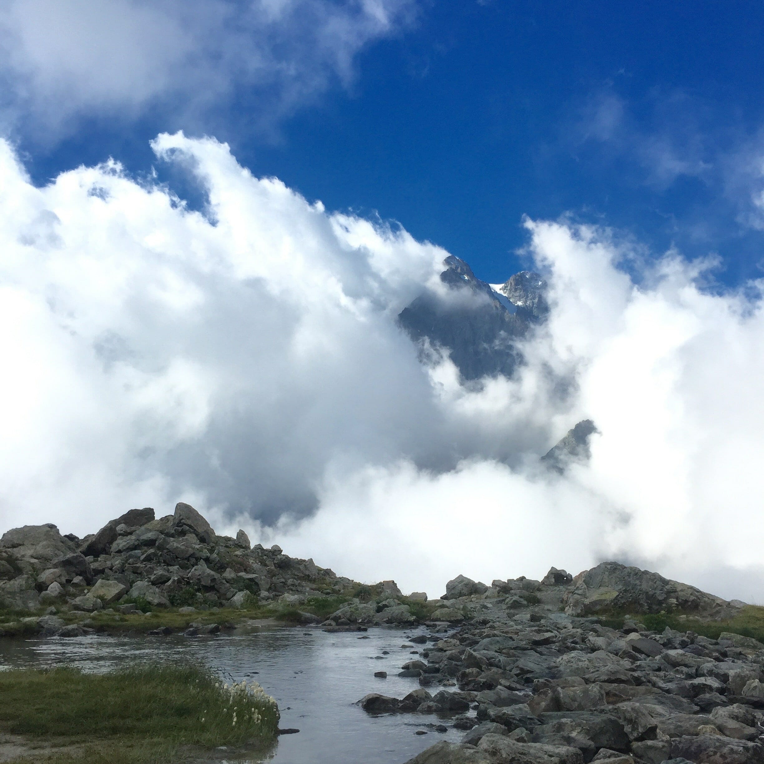 À partir de là, le parcours se fait progressivement de plus en plus alpin. Nous sommes à 2200m d’altitude et le paysage change pour dévoiler progressivement l’objet de notre effort : le Glacier Blanc.