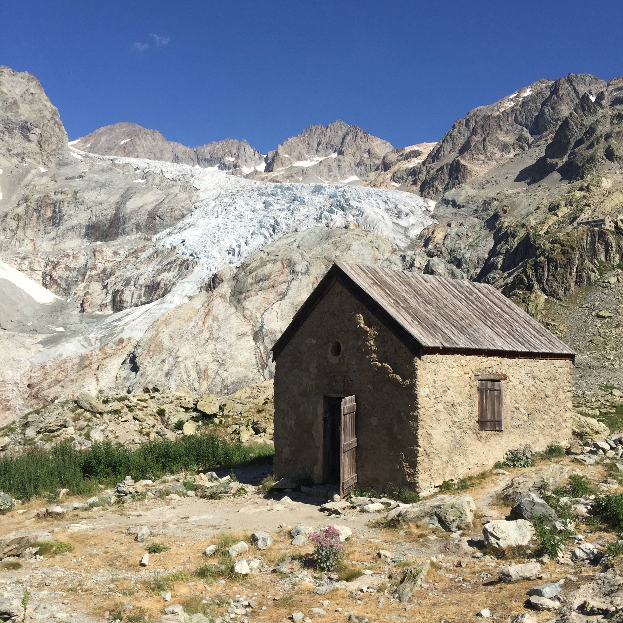 Après ces passages plus compliqués et avant d’affronter les derniers 100m de dénivelé jusqu’au refuge, on traverse un nouveau replat où se trouve l’ancien Refuge Tuckett près du lac éponyme. Ce refuge est étonnant à plus d’un titre. Tout d’abord, son nom vient d’un des premiers alpinistes à s’aventurer sur le Glacier blanc et à tenter l’ascension de la Barre en 1862. D’autre part, il est un témoin du recul inexorable du glacier blanc. En effet, à l’époque de sa construction à la fin du 19e siècle, il était au pied du Glacier, ni plus ni moins !