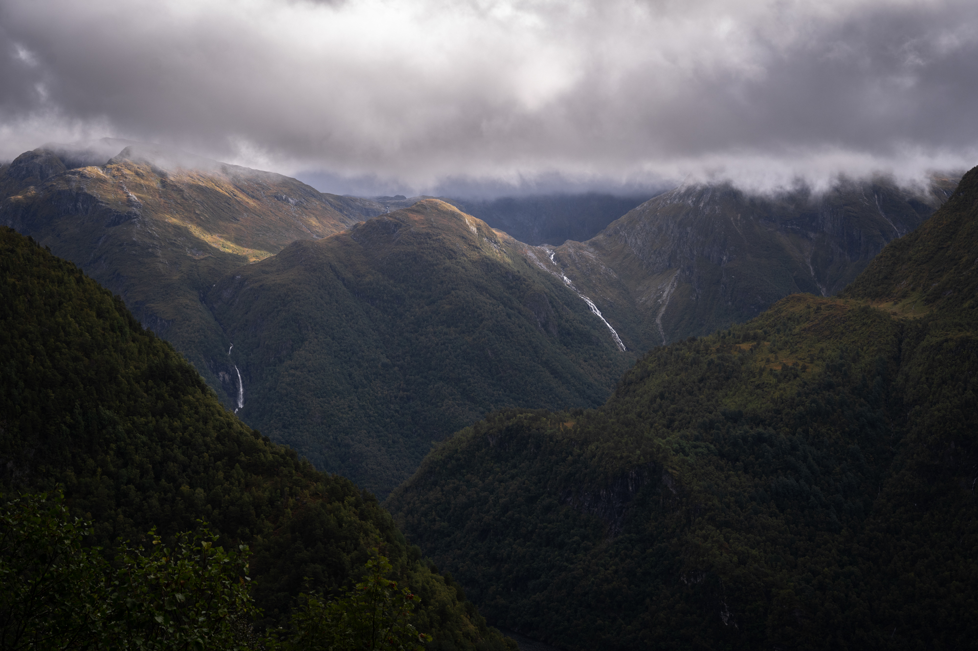 Nous suivons aveuglément les fanons servant de balisage. Après environ 45 minutes, le sentier se perd dans une face abrupte et végétale. La petite compagnie que nous formons se regarde et s’interroge sur une évidence : le chemin va droit dans la pente. Direct ou brutal, ce sentier est aussi intransigeant que la mentalité norvégienne. J’aurais sans doute dû éviter cette pensée, la pluie revient. La pente est tellement raide que nous devons poser les mains, nous agripper, nous extirper de cette végétation dégoulinante. Il y a déjà bien longtemps que nos pieds baignent dans une gadoue permanente. Gueule dans le brouillard, pieds dans la tourbe, nos carcasses subissent les éléments. Nous grimpons, engoncés dans nos capuches en souffrant silencieusement.