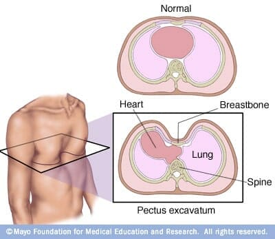 “Le pectus excavatum (ou thorax en entonnoir) est la déformation la plus fréquente du thorax, le plus souvent congénitale (présente à la naissance) ou se développant au cours de la croissance, caractérisée par un enfoncement plus ou moins prononcé de la partie inférieure du sternum, causée par une longueur excessive des cartilages costaux, qui relient les côtes au bord latéral du sternum” (source : Wikipedia). À lire cette définition de Wikipédia, cela n’a pas l’air d’être terrible pourtant cette malformation cause une véritable compression des organes internes (poumons et coeur).