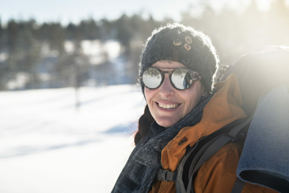 Avec nos sacs, on se rend vite compte que les quelques kilomètres (7) qui nous séparent de la cabane vont être longs. Malgré les raquettes, on s’enfonce de plusieurs dizaine de centimètres. J’espère secrètement u’il n’y ait pas trop de dénivelé, pour une fois ! En effet, avec mon sac et mon matos photo, je perds énormément d’énergie à m’enfoncer dans la poudreuse. Je ne dis rien car sacrifier les images face à un paysage aussi grandiose serait un sacrilège ! Et à peine a-t-on franchi la première côte que notre terrain de jeu pour les deux prochains jours apparaît immaculé et infini !