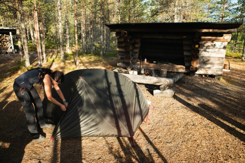 Comme partout en Scandinavie et a fortiori en Finlande, même au milieu de nulle part, vous trouverez des abris destinés aux voyageurs. Gratuits et libres d’accès, ces infrastructures participent aussi à la magie du voyage en Finlande. Malgré cela, nous avions pris notre tente afin d’anticiper tout imprévu. Au cas où d’autres voyageurs arriveraient, nous décidons de monter la tente afin de ne pas monopoliser l’abri inutilement.