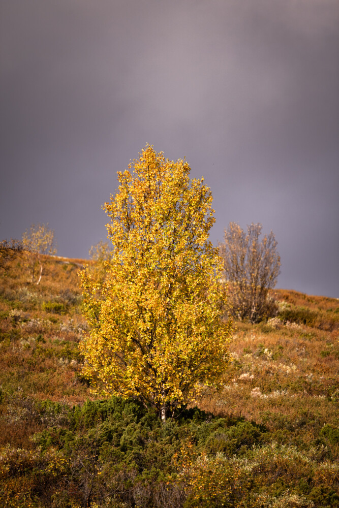 Bien que le ciel soit menaçant, il y a une percée presque divine qui enflamme les bouleaux dans leur parure d’automne. J’avais l’impression d’ouvrir un trésor en pleine tempête, presqu’ébloui par l’or jaillissant. Malgré le vent, cette lumière nous réchauffait tandis que nous avancions à travers le plateau à la recherche des boeufs musqués. En cette période, ils ne sont pas facile à débusquer. En effet, leur pelage brun les fond dans la masse automnale des montagnes. Pourtant, au loin, j’aperçois un autre groupe de marcheur qui se met soudainement à accélérer. J’empoigne mon appareil photo et scrute l’horizon dans leur direction. Puis, une tache, une seconde puis un amas.