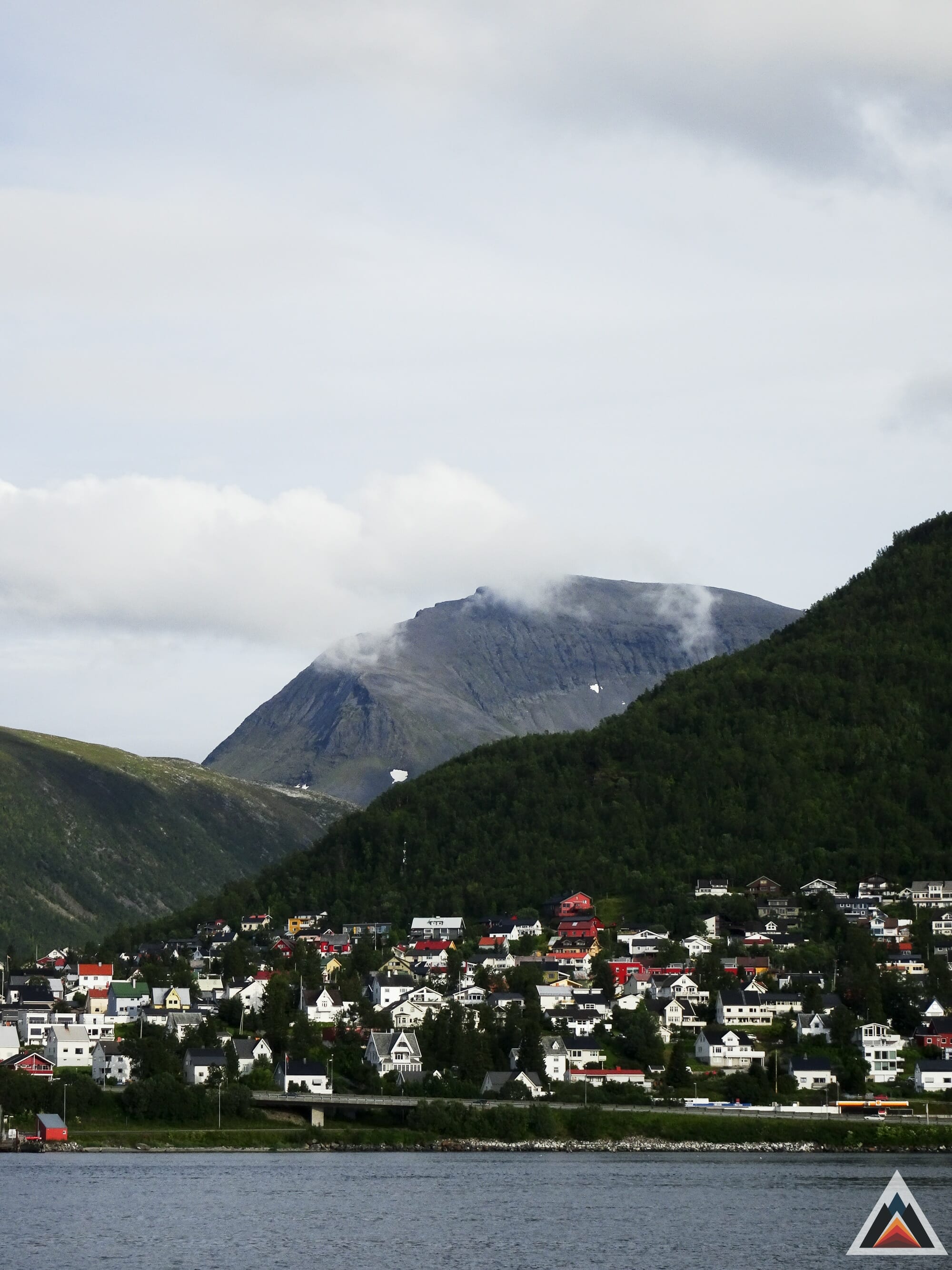 Il est minuit à l’atterrissage à Tromsø. Le soleil déclinant éclaire encore de ses pâles rayons le Tromsdalstinden (1238m). La Montagne domine la ville comme un géant de pierre. Ces lueurs solaires en pleine nuit offrent une atmosphère étrange et réconfortante à la fois.