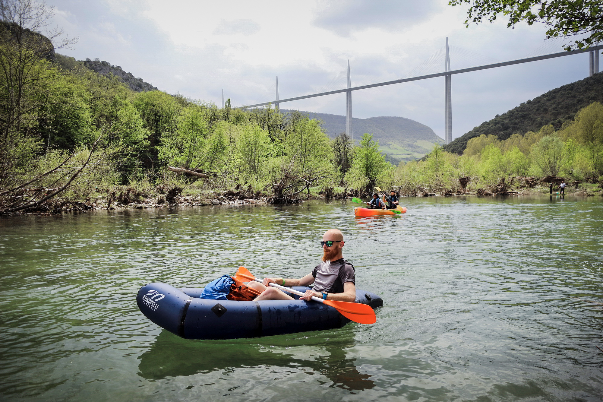 Après avoir avalé un aligot dans le centre ville de Millau, nous prenons la direction du petit village des Cressels où nous nous mettrons à l’eau. Vous commencez à me connaître, j’avais pris avec moi mon packraft Kokopelli pour faire la descente. Même si ce dernier ne dispose pas de spraydeck (“pont”), la rivière n’est qu’en niveau II, cela devrait donc passer sans trop de soucis.