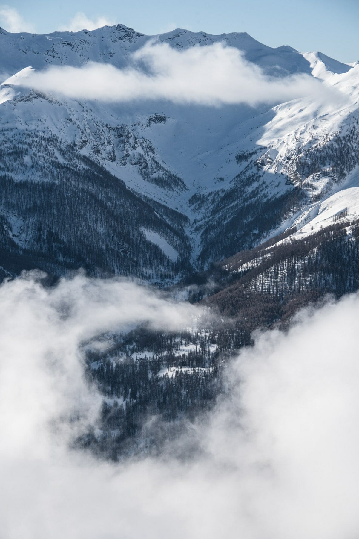 Monté sur la crête, je pouvais contempler le plateau et derrière moi, toute la vallée s’allongeait dans son lit. C’est alors que j’ai décidé de descendre hors sentiers pour rejoindre la station. Je ne l’ai pas regretté : de l’autre côté de la vallée, les nuages jouaient avec les cimes dans un balet infini.