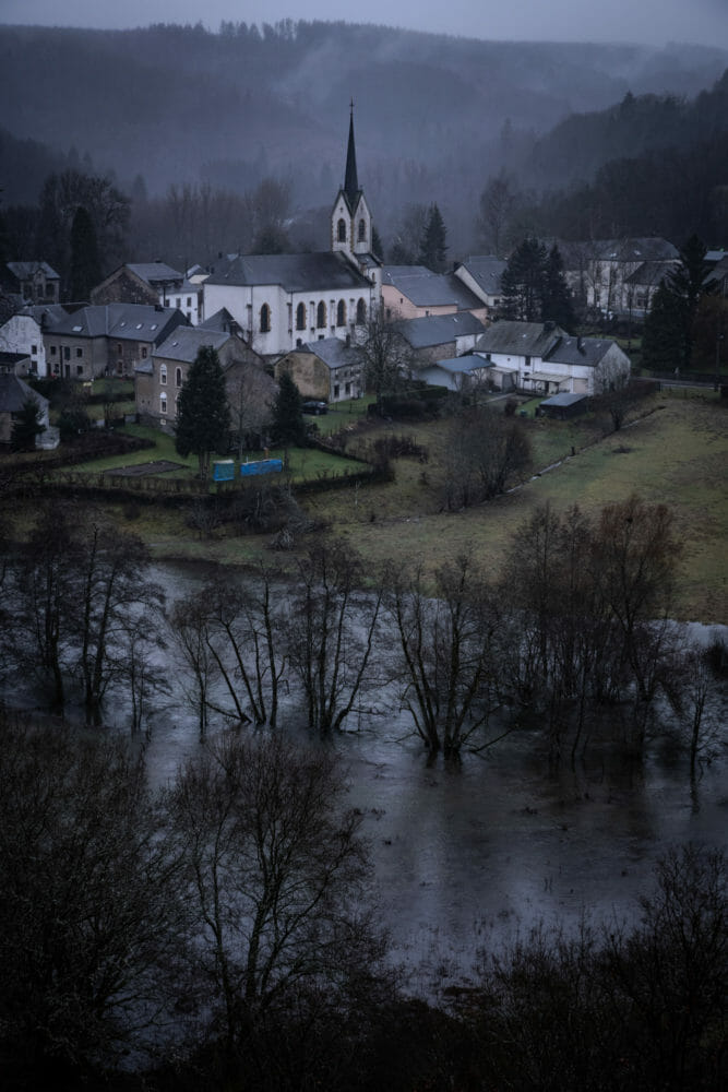 Le lendemain, la météo nous laisse un semblant de répit. Pour une fois, je décide de me fier à une randonnée existante : la promenade des romains. Elle démarre à la Maison du Parc de la Haute-Sûre Forêt d’Anlier pour traverser Martelange et s’élever vers les forêts qui dominent le village. Vu la météo de la veille, nous nous sommes retrouvés dans la brume et les arbres sans parures émergeaient comme de pauvres squelettes damnés… Excusez mon lyrisme mais ces paysages ont toujours été pour moi une source intarissable d’inspiration. J’ai toujours préférés l’obscurités de l’hiver à l’éclatante luminosité estivale, sans doute des restes de ma passion pour le romantisme allemand.