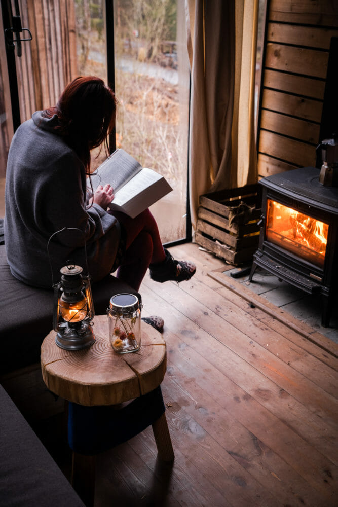 La simplicité d’une cabane : un feu de bois, des bougies et une fenêtre ouverte sur le monde